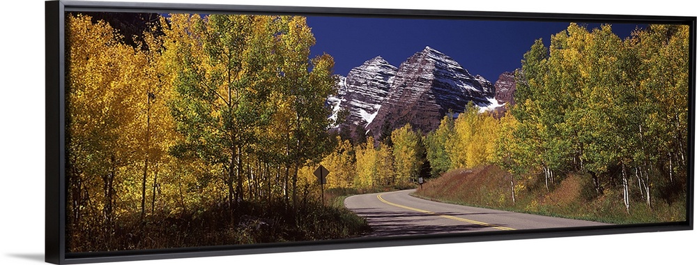 <p>Large, horizontal photograph of a road winding through a fall colored forest, the Maroon Bells in the background beneath a deep blue sky, in Pitkin County, Colorado.</p>