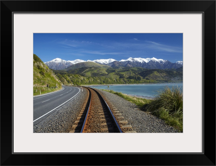 <p>Road, railway, Seaward Kaikoura Ranges, Mangamaunu, Kaikoura, Marlborough, South Island, New Zealand.</p>