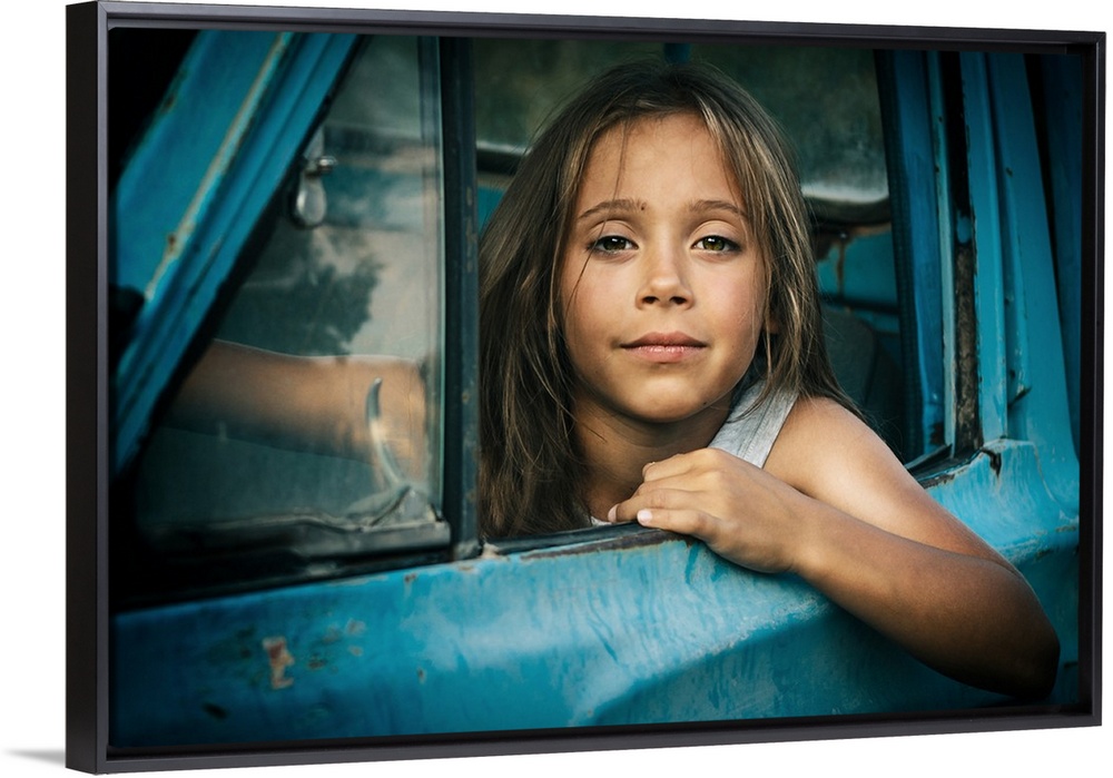 <p>Portrait of a young girl leaning out the window of a blue car.</p>