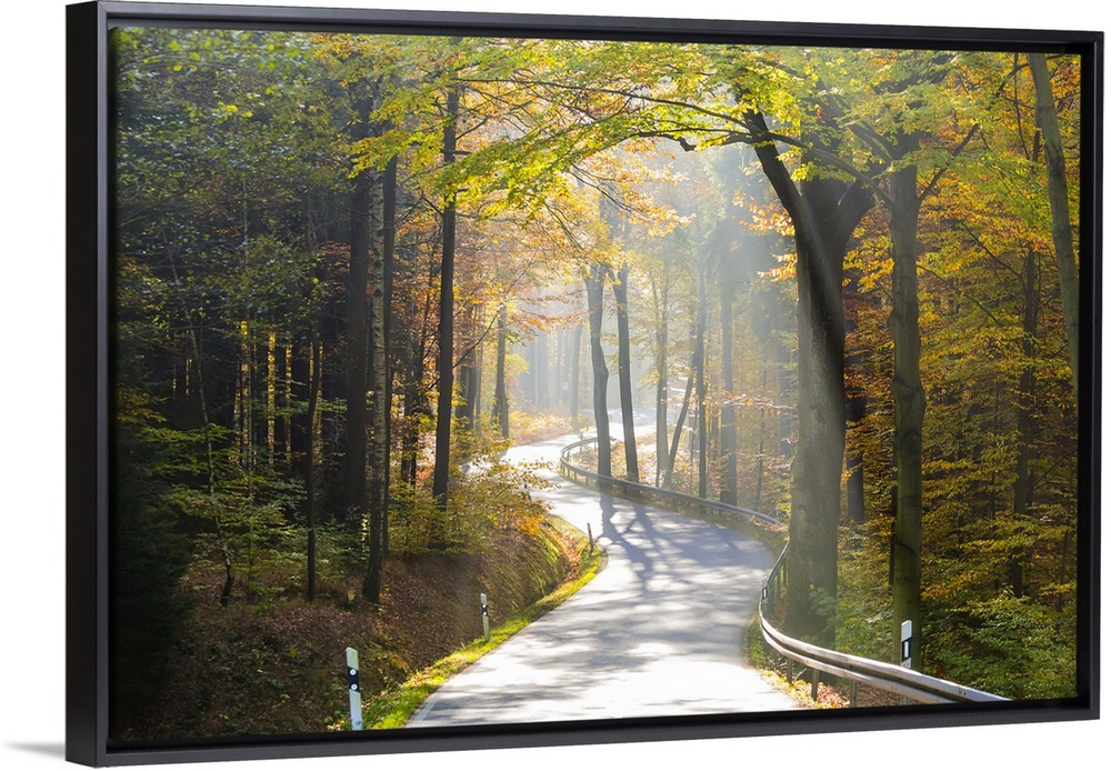 <p>Road through autumn woodland, Saxon Switzerland, Saxony, Germany</p>