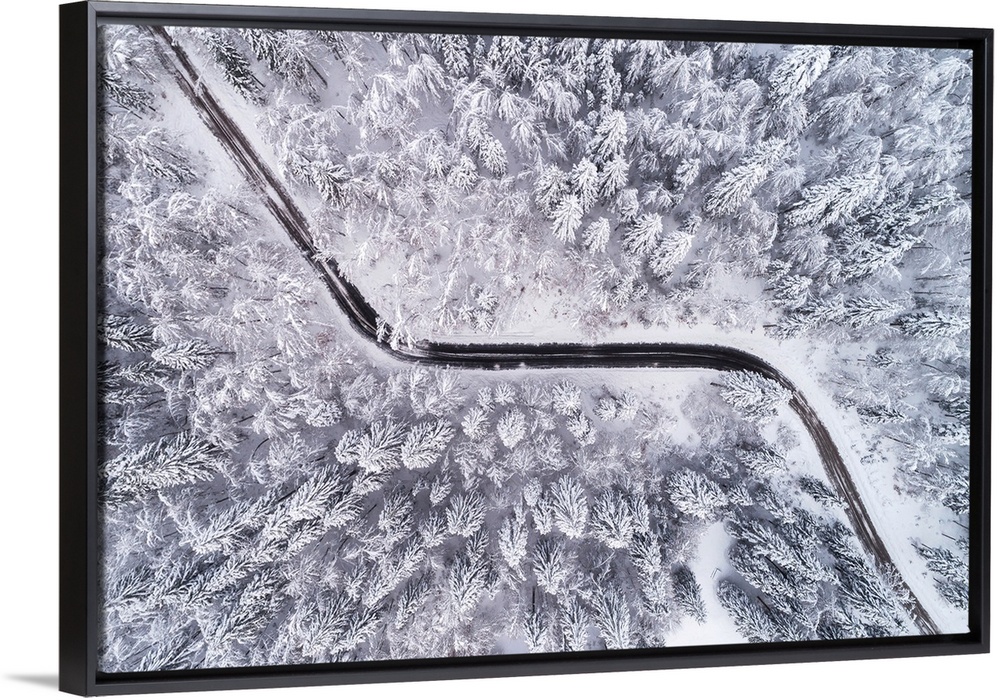 <p>Aerial view of the road through a winter forest.</p>