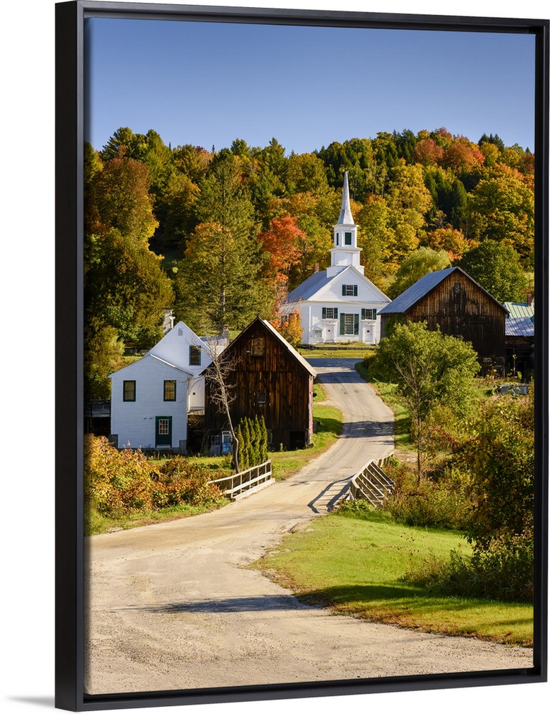 <p>Photograph of a gravel road leading up the hill to a white church surrounded by various wooden buildings and colorful Fall trees.</p>