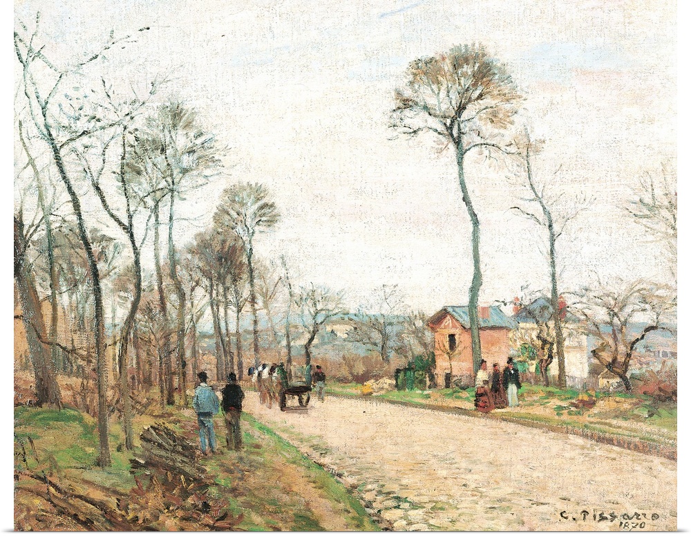 <p>The Road to Louveciennes, by Camille Pissarro, 1870, 19th Century, oil on canvas, cm 46,5 x 55 - France, Ile de France, Paris, Muse dOrsay, RF1937-50. All. Street road to Louveciennes trees branches houses persons strolling. (246307) Everett Collection\Mo</p>