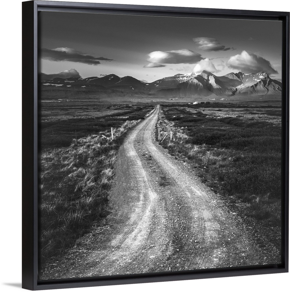 <p>Black and white photo of a path leading to tall mountains on the horizon.</p>