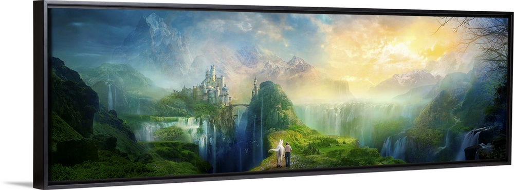 <p>Fantasy artwork of man walking a white horse through a magical and serene looking valley, with endless waterfalls and a castle in the distance.</p>