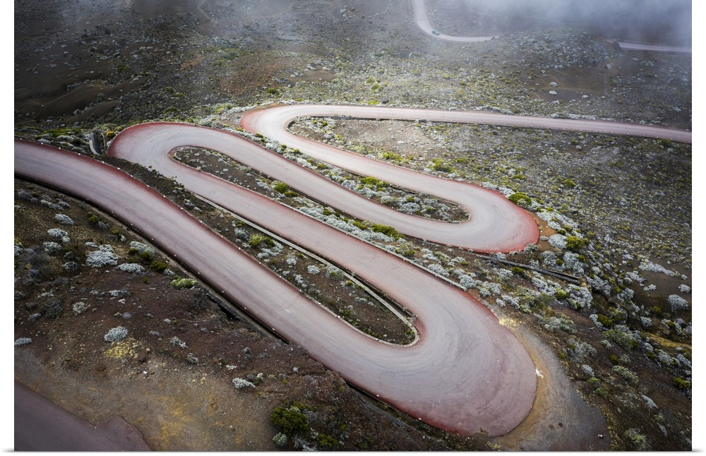 <p>France, Reunion Island, Piton de la Fournaise, Road to the Plaine des Sables approaching the crater of Piton de la Fournaise volcano.</p>