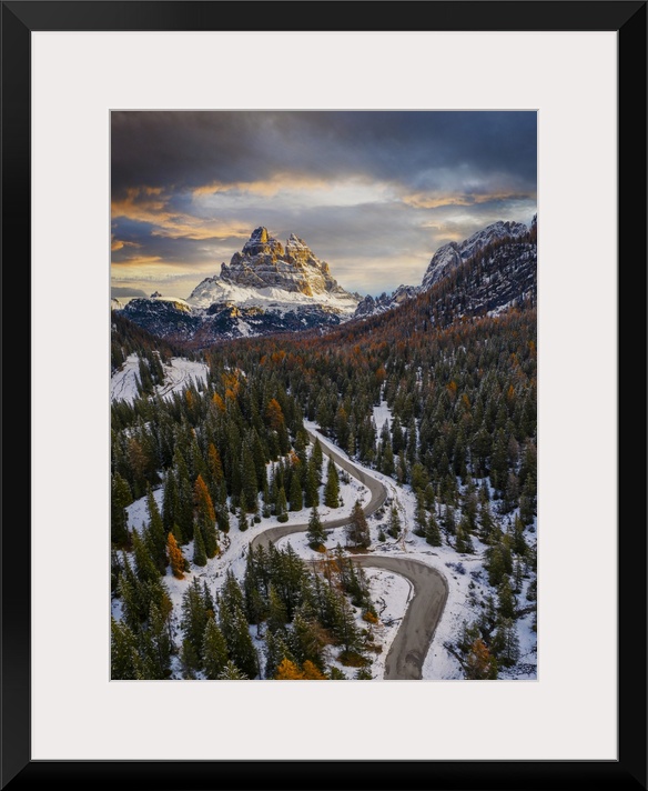 <p>Aerial view of road to Tre Cime di Lavaredo at sunrise, Misurina, Belluno, Auronzo di Cadore, Veneto, Italy</p>