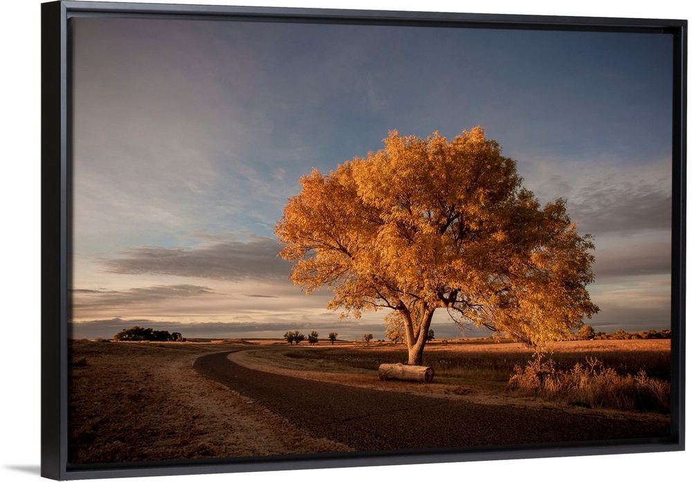 <p>Landscape photograph of a curved road with the sun shining on a large yellow tree on the side.</p>