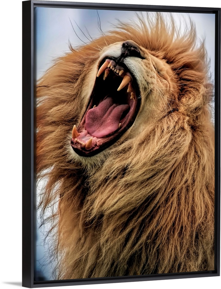 <p>A male lion roaring loudly, showing off its fangs.</p>