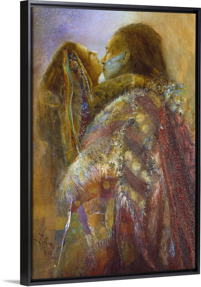 <p>A contemporary painting of a a Native American couple locked in embrace underneath colorful blankets.</p>