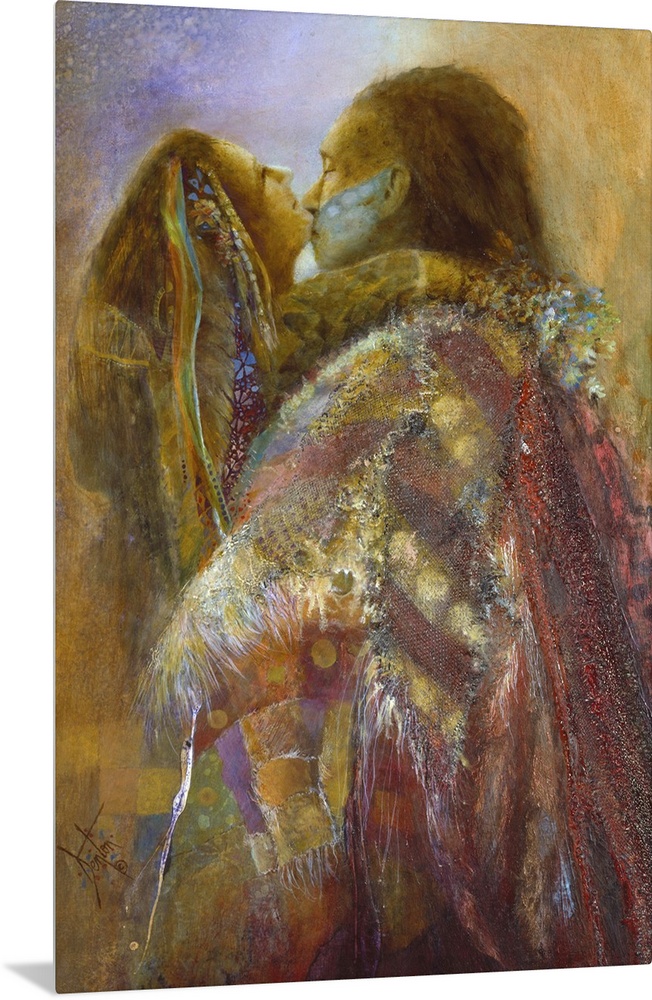 <p>A contemporary painting of a a Native American couple locked in embrace underneath colorful blankets.</p>