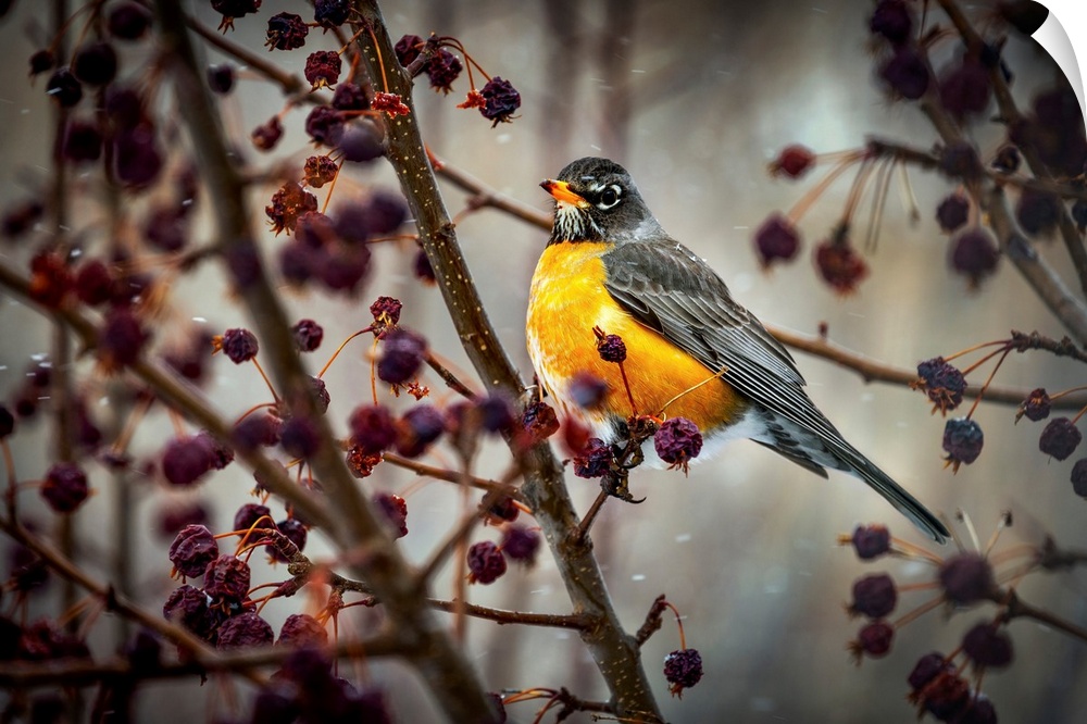 <p>Robin sitting on an apple tree branch with dried small apples and snow flurries; Calgary, Alberta, Canada</p>