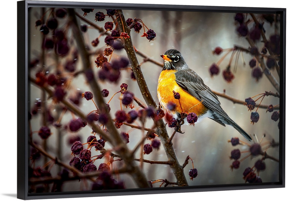 <p>Robin sitting on an apple tree branch with dried small apples and snow flurries; Calgary, Alberta, Canada</p>