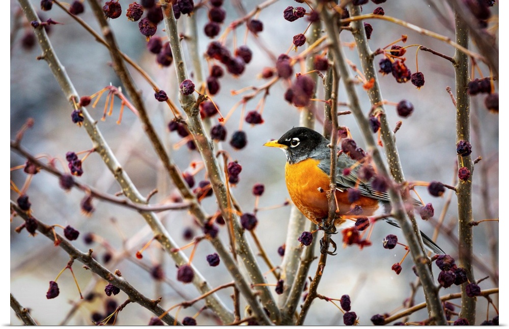 <p>Robin sitting on an apple tree branch with dried small apples; Calgary, Alberta, Canada</p>