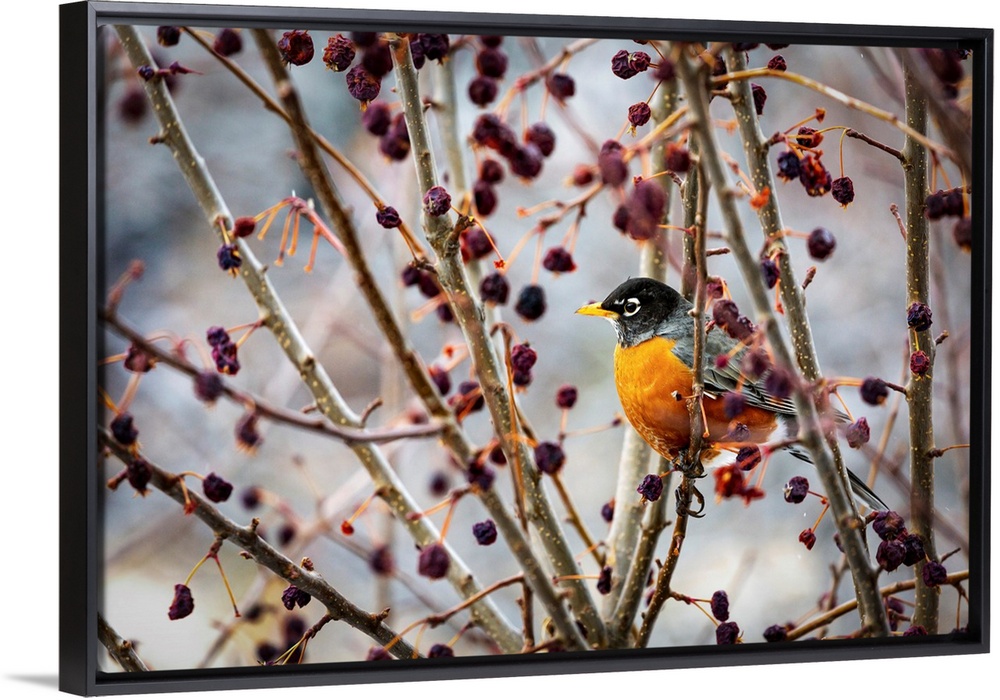 <p>Robin sitting on an apple tree branch with dried small apples; Calgary, Alberta, Canada</p>