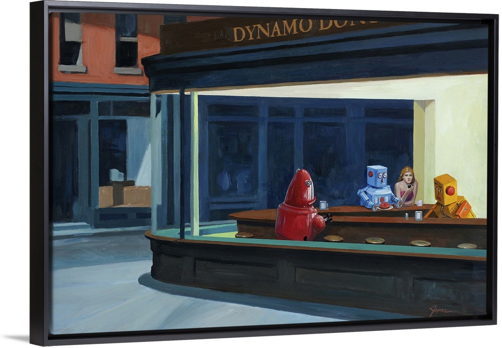 <p>A contemporary painting of retro toy robots sitting in a donuts shop at night recreating a famous painting.</p>
