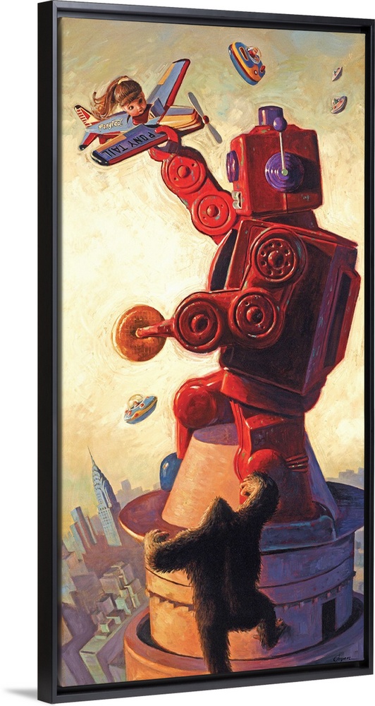 <p>A contemporary painting of a giant red retro toy robot atop a skyscraper holding a donut and fighting off a toy planes.</p>