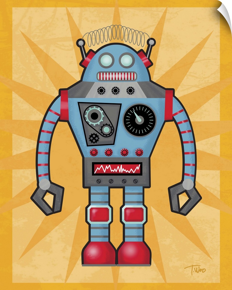 <p>Fun illustration of a red and blue robot on a yellow background.</p>