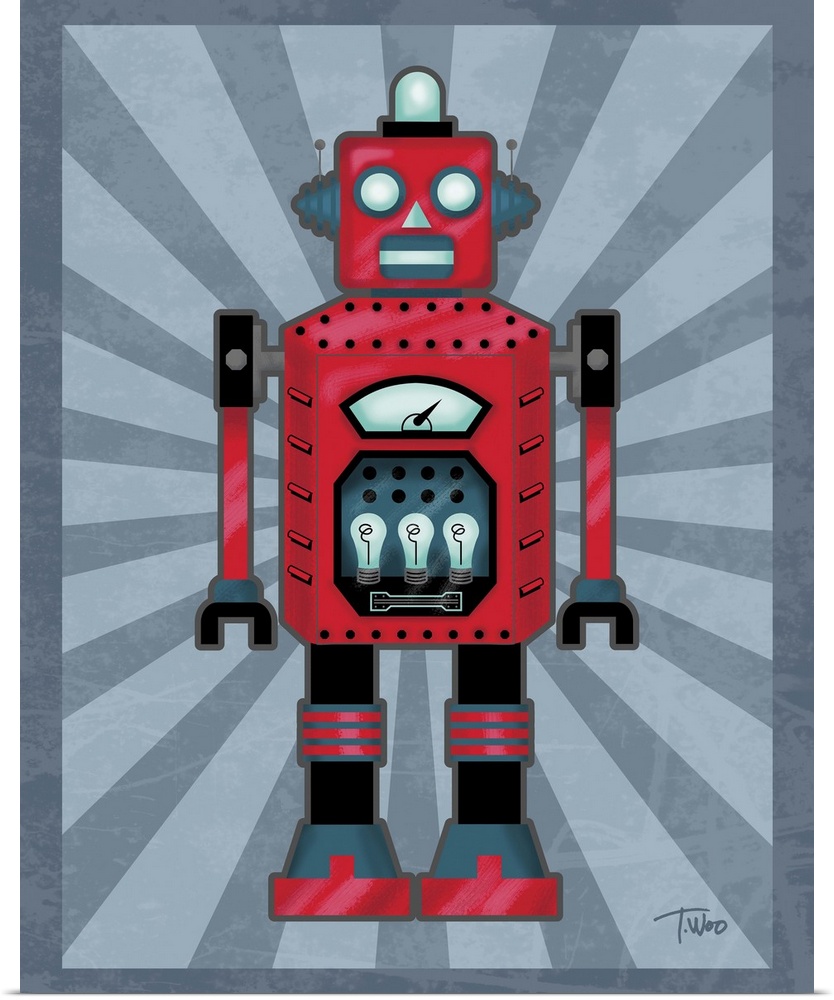 <p>Fun illustration of a red, black, and blue robot on a blue-gray background.</p>