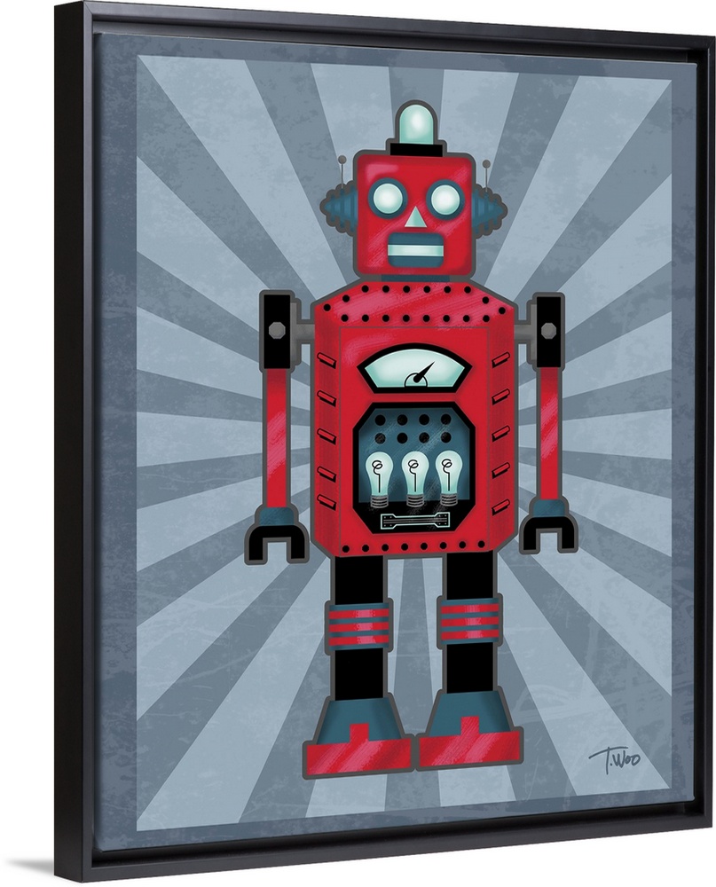 <p>Fun illustration of a red, black, and blue robot on a blue-gray background.</p>