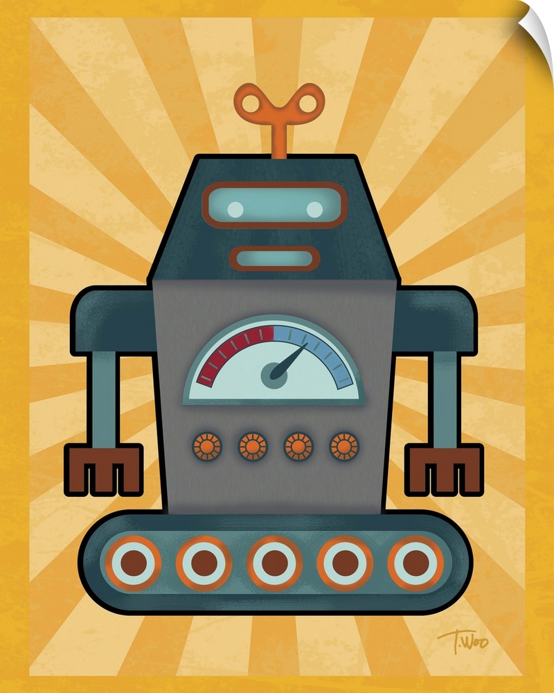 <p>Fun illustration of a blue, orange, and gray robot on a yellow background.</p>