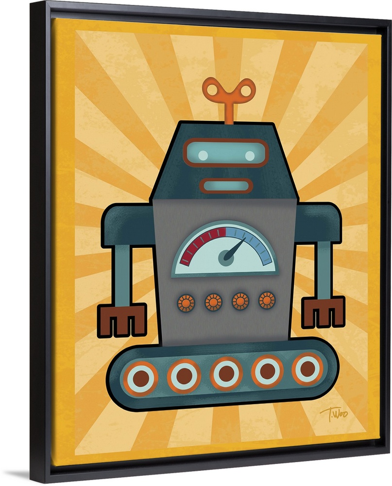 <p>Fun illustration of a blue, orange, and gray robot on a yellow background.</p>