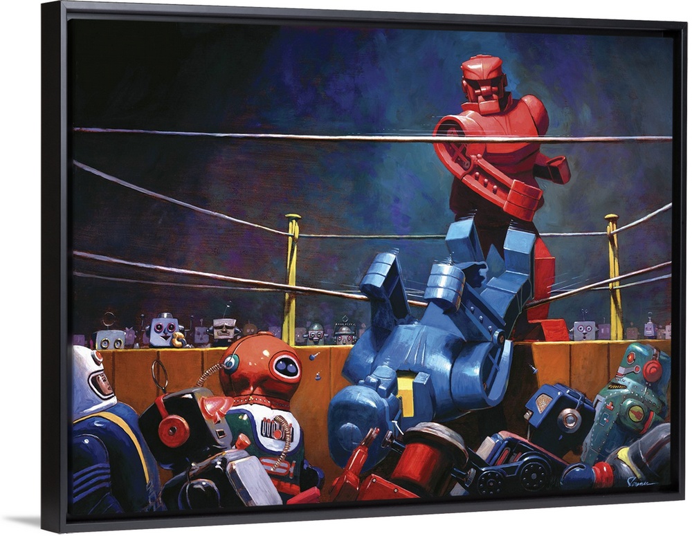 <p>A contemporary painting of a giant retro toy robot boxing match.</p>