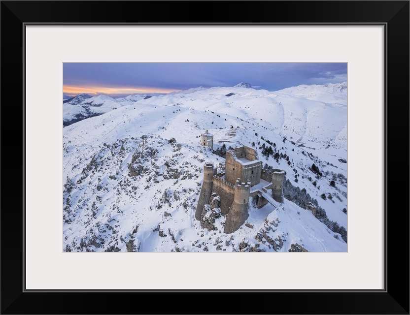 <p>Aerial winter view of Rocca Calascio castle and the Santa Maria della Pieta church in the snowy landscape at dusk, Campo Imperatore, L'Aquila province, Abruzzo region, Italy, Europe</p>