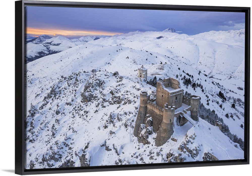 <p>Aerial winter view of Rocca Calascio castle and the Santa Maria della Pieta church in the snowy landscape at dusk, Campo Imperatore, L'Aquila province, Abruzzo region, Italy, Europe</p>