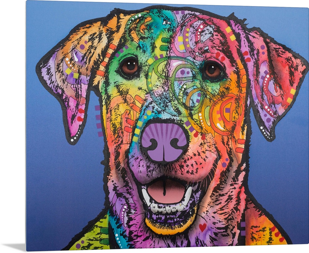 <p>Colorful painting of a happy Labrador with abstract designs on a blue background.</p>