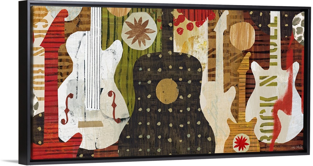<p>Abstract painting of various silhouettes of guitars with different stencils and patterns painted on and behind them.</p>