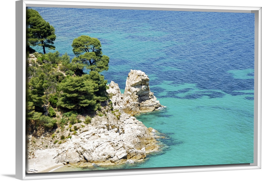 <p>Clear blue water, rock cliffs and Mediterranean pine trees on coast of Chalkidiki peninsula , Greece.</p>