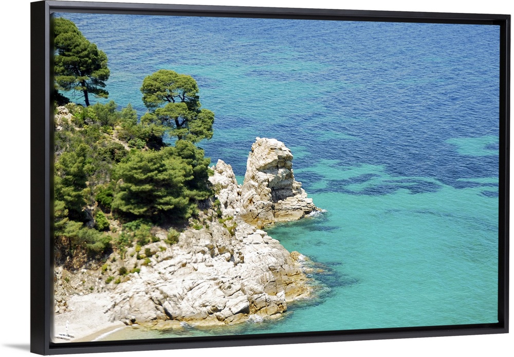 <p>Clear blue water, rock cliffs and Mediterranean pine trees on coast of Chalkidiki peninsula , Greece.</p>