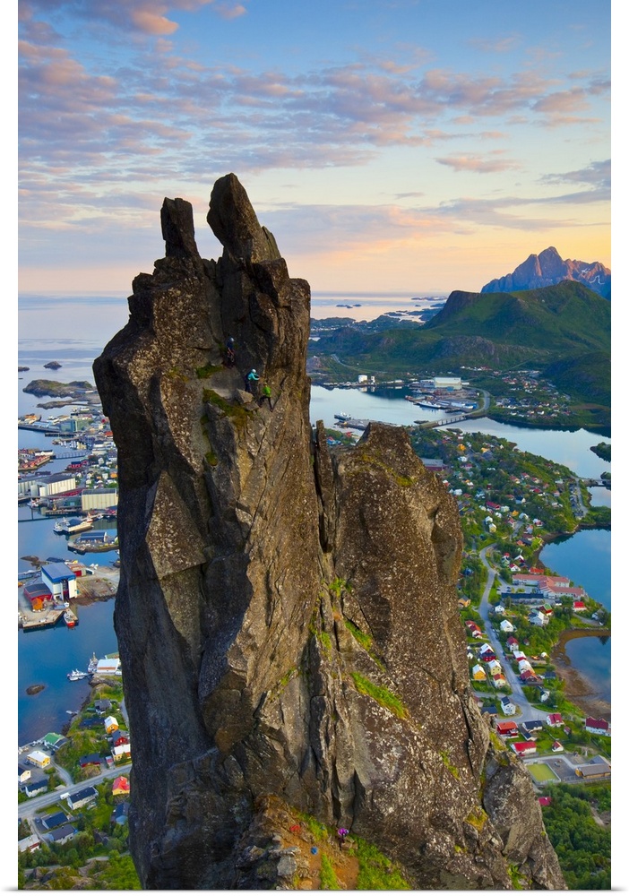 <p>Rock Climbers scale the famous Svolvaergeita, Svolvaer, Lofoten, Nordland, Norway</p>