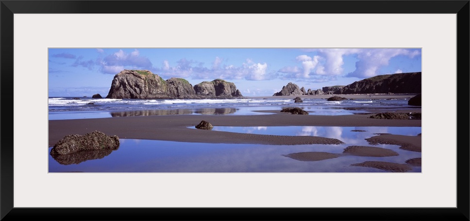 <p>Panoramic photograph of shoreline covered in puddles of water with large stone and rock structures in the ocean under a cloudy sky.</p>