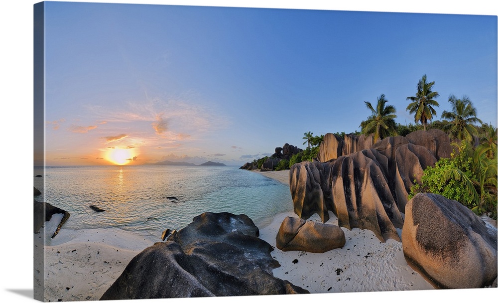 <p>Rock Formations and Palm Trees at Sunset, Anse Source doArgent, La Digue, Seychelles</p>
