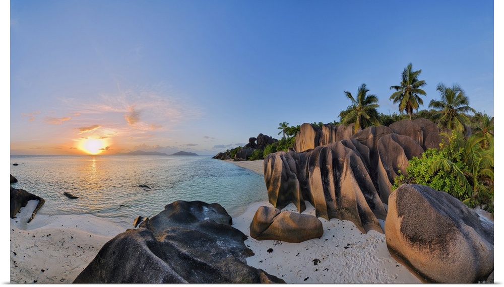 <p>Rock Formations and Palm Trees at Sunset, Anse Source doArgent, La Digue, Seychelles</p>