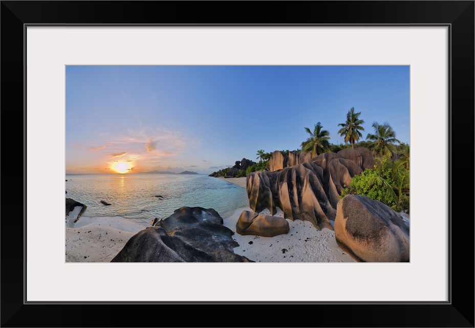 <p>Rock Formations and Palm Trees at Sunset, Anse Source doArgent, La Digue, Seychelles</p>