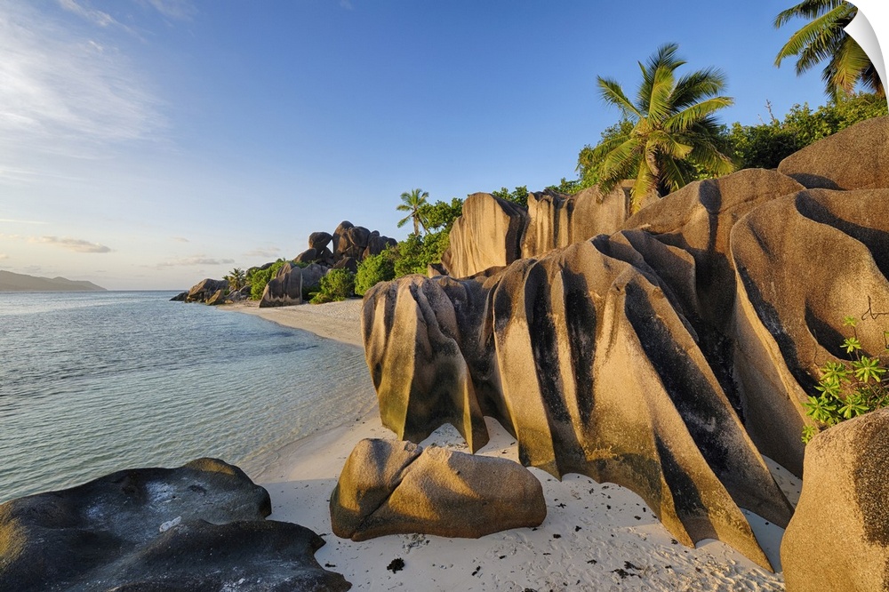<p>Rock Formations and Palm Trees near Sunset, Anse Source doArgent, La Digue, Seychelles</p>