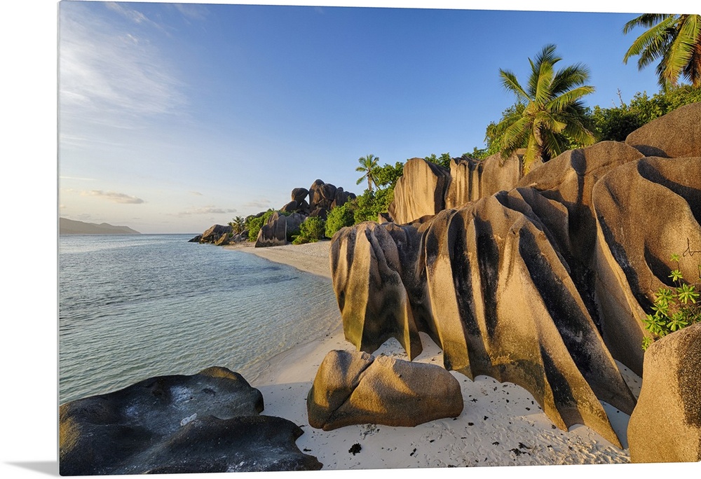 <p>Rock Formations and Palm Trees near Sunset, Anse Source doArgent, La Digue, Seychelles</p>