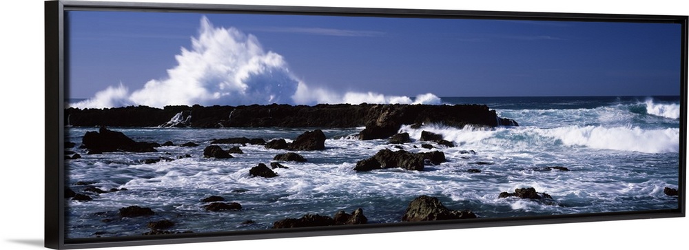 <p>Panoramic photograph of rocks at sea with waves crashing around them under a clear sky.</p>