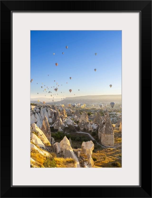 <p>Rock formations, hot air balloons at sunrise, Goreme, Goreme Historical National Park, Nevsehir District, Nevsehir Province, UNESCO, Cappadocia, Central Anatolia Region, Turkey</p>