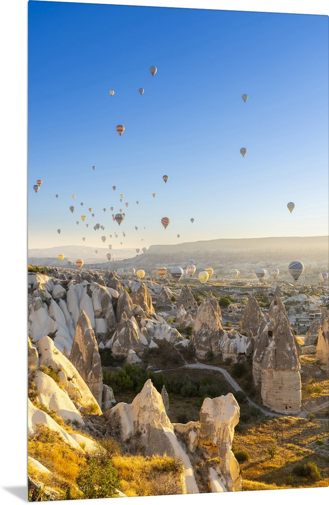 <p>Rock formations, hot air balloons at sunrise, Goreme, Goreme Historical National Park, Nevsehir District, Nevsehir Province, UNESCO, Cappadocia, Central Anatolia Region, Turkey</p>