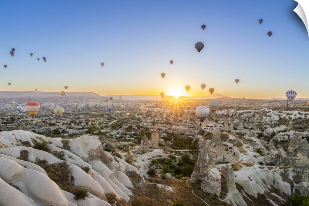 <p>Rock formations, hot air balloons at sunrise, Goreme, Goreme Historical National Park, Nevsehir District, Nevsehir Province, UNESCO, Cappadocia, Central Anatolia Region, Turkey</p>