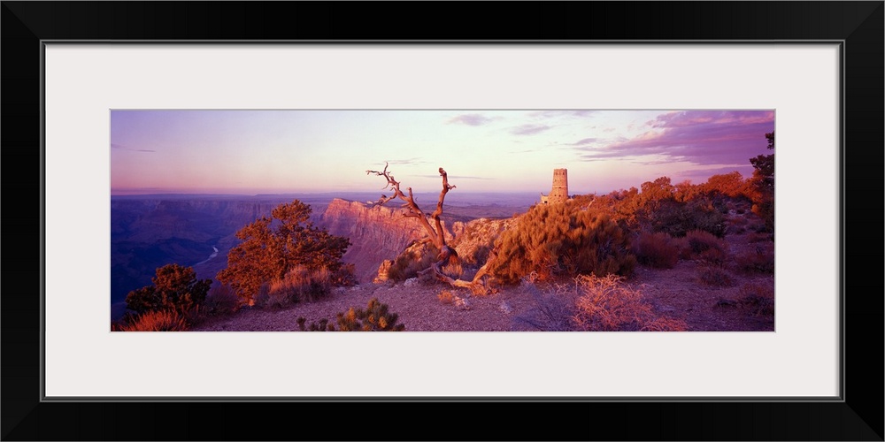 <p>This wall art is a panoramic of a desert landscape taken from the top of a canyon wall.</p>