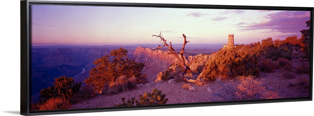 <p>This wall art is a panoramic of a desert landscape taken from the top of a canyon wall.</p>