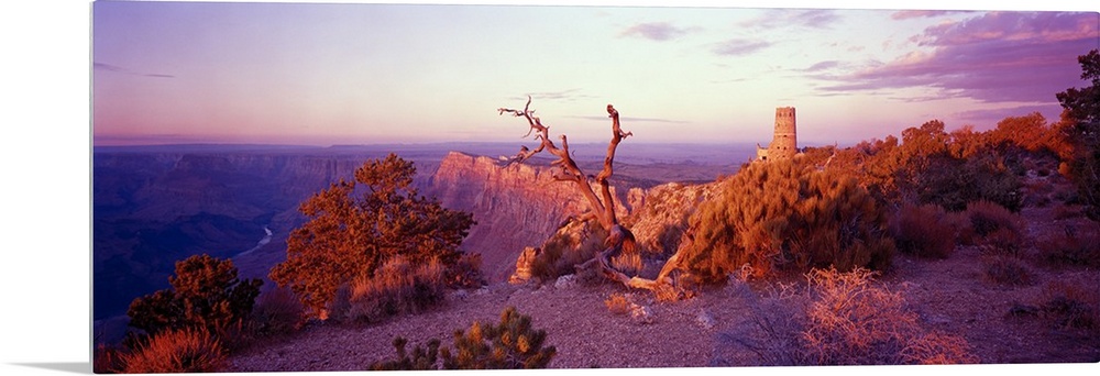 <p>This wall art is a panoramic of a desert landscape taken from the top of a canyon wall.</p>