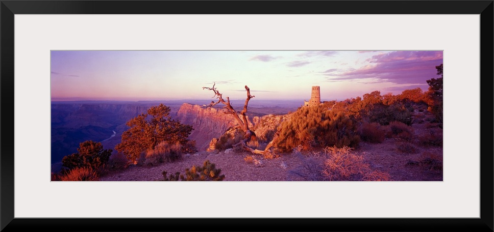 <p>This wall art is a panoramic of a desert landscape taken from the top of a canyon wall.</p>