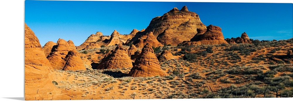 <p>Panoramic photograph shows a field of rock structures among a dry terrain in the Southwestern United States on a cloudless day. Leading up to the rocks are patches of grass growing in the hot climate.</p>