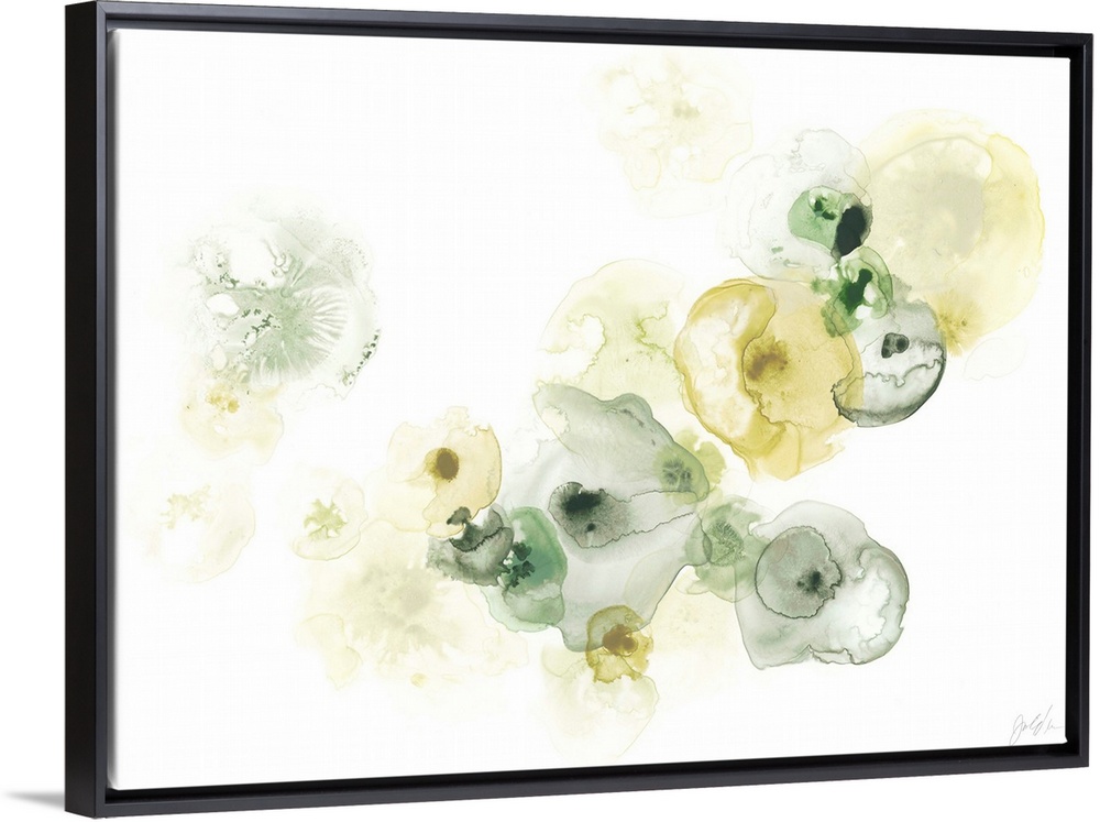 <p>This decorative art features green and yellow watercolor droplets to form lichen like shapes on a white background.</p>